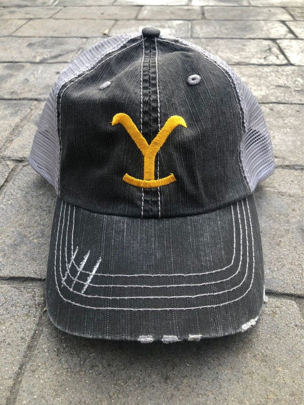Yellowstone Brand on Front Middle Embroidered Trucker hat with mesh back and velcro closing. Unisex